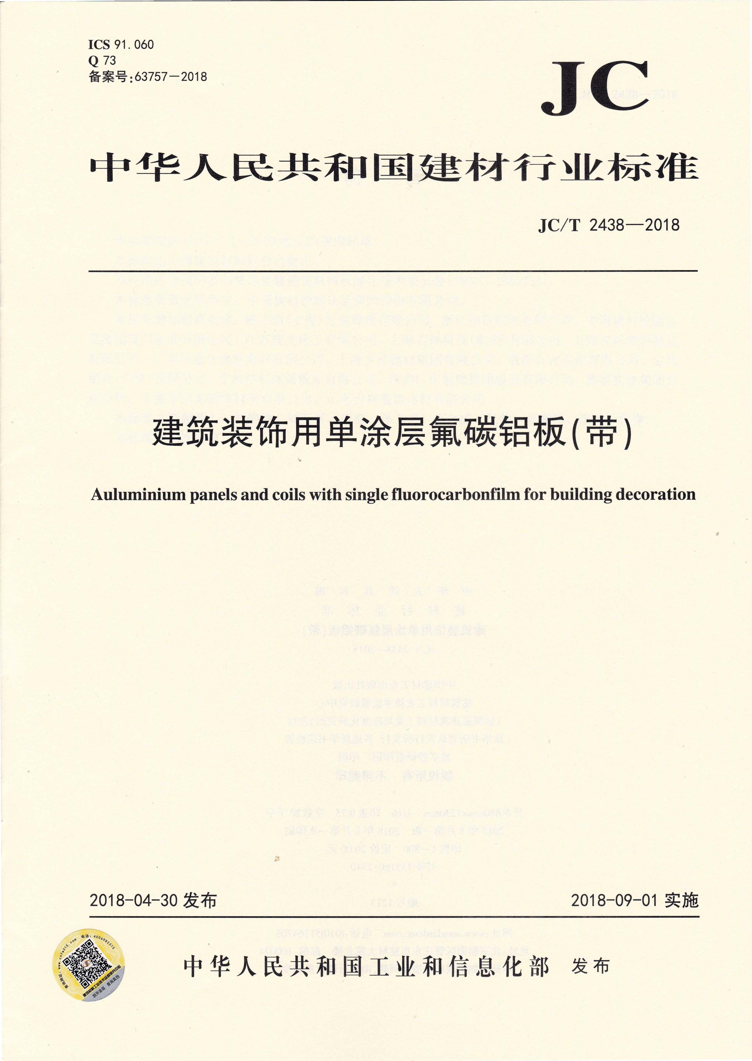 近日,由中國(guó)建筑材料聯(lián)合會(huì)提出,雅泰實(shí)業(yè)集團(tuán)有限公司參與起草的JC/T 2439-2018《建筑裝飾用烤瓷鋁板》、JC/T 2438-2018《建筑裝飾用單涂層氟碳鋁板(帶)》兩項(xiàng)行業(yè)標(biāo)準(zhǔn)于2018年4月30日首次發(fā)布,2018年9月1日起正式實(shí)施。