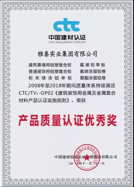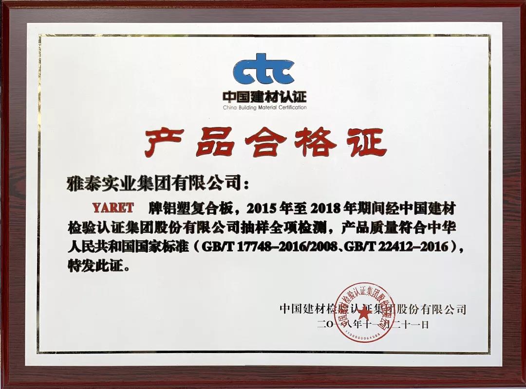 會上,雅泰產(chǎn)品憑借2008年至今2018年期間質(zhì)量體系持續(xù)滿足CTC/TVL-OP02《建筑裝飾用金屬及金屬復(fù)合材料產(chǎn)品認(rèn)證實(shí)施規(guī)則》,榮獲2018年度CTC產(chǎn)品質(zhì)量認(rèn)證優(yōu)秀獎。YARET牌鋁塑復(fù)合板,2015年至2018年期間經(jīng)中國建材檢驗(yàn)認(rèn)證集團(tuán)股份有限公司抽樣全項(xiàng)檢測,產(chǎn)品質(zhì)量符合中華人民共和國國家標(biāo)準(zhǔn)(GB/T 17748-2016/2008、GB/T22412-2016),被授予2018年度產(chǎn)品合格證。