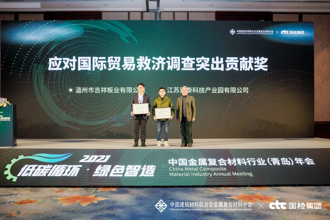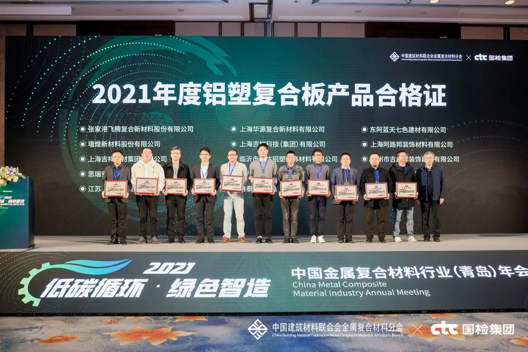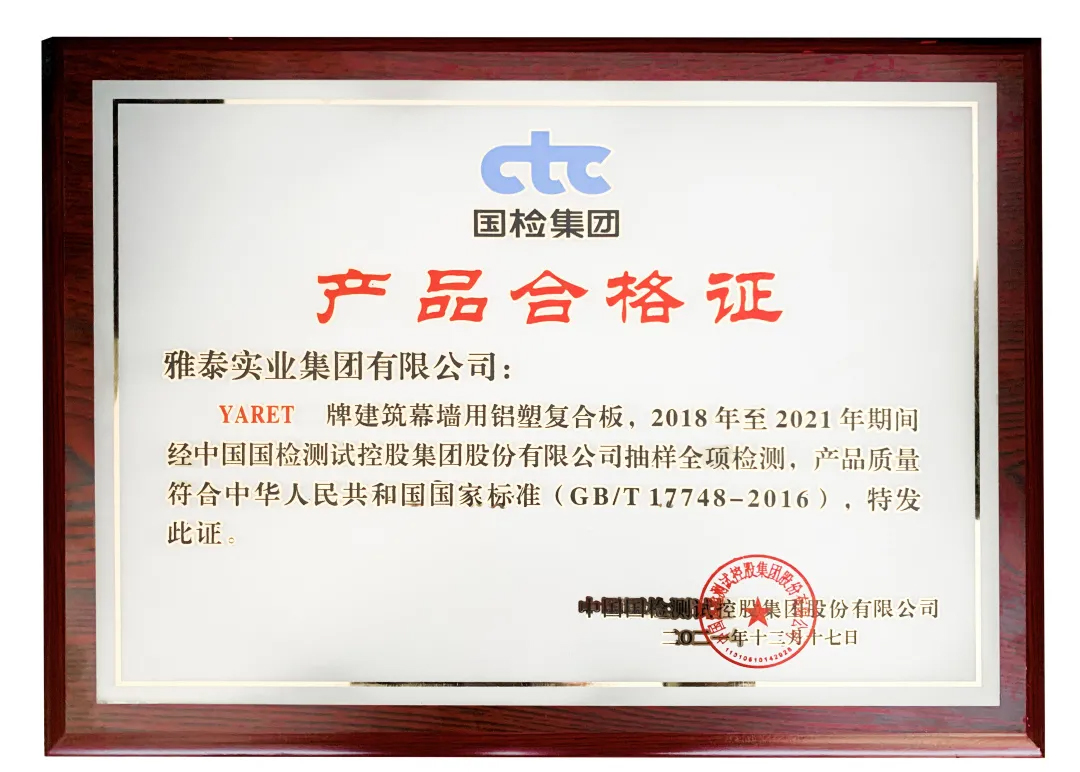 會上,對2021年度行業(yè)優(yōu)秀的產(chǎn)品與企業(yè)進行了表彰頒獎——雅泰 YARET 牌鋁塑復(fù)合板,于2018年至2021年期間經(jīng)中國建材檢驗認證集團股份有限公司抽樣全項檢測,產(chǎn)品質(zhì)量符合中華人民共和國國家標準(GB/T 17748-2016),榮獲2021年度CTC認證產(chǎn)品合格證。