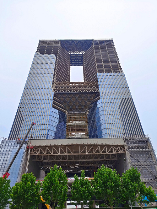 該斜面幕墻區(qū)域,全手工焊接,為了保證建筑外立面的平整度,要求產品在工廠內加工精度誤差不能超過2mm,經過全員共同努力,緊跟大廈主體結構同步施工,已經順利配合外墻裝飾材料的供貨20000余平方。
