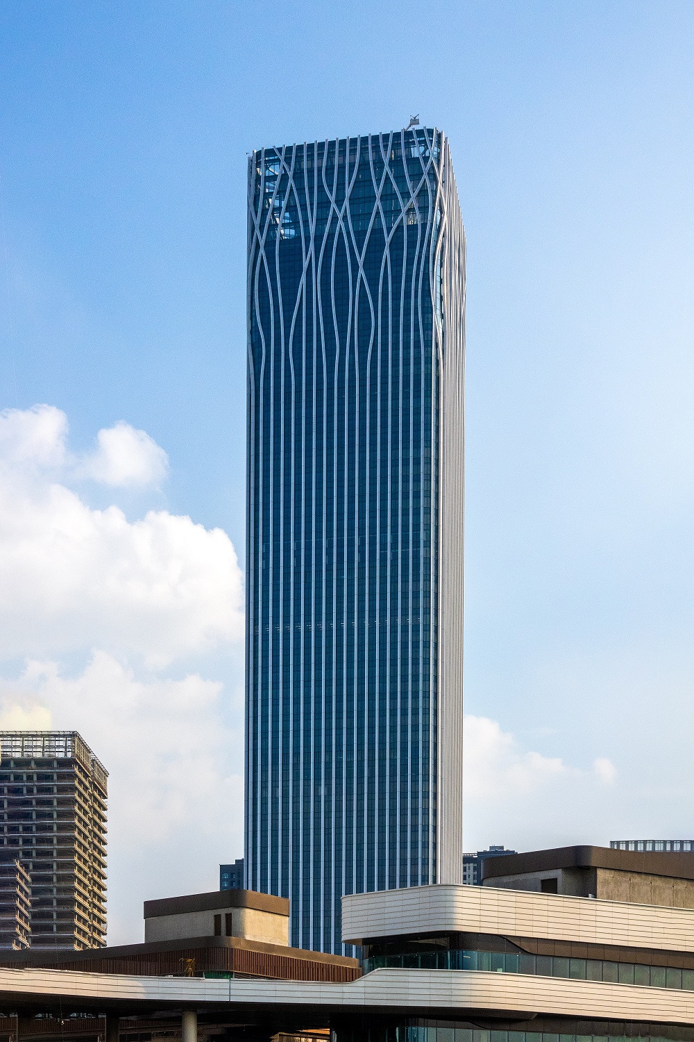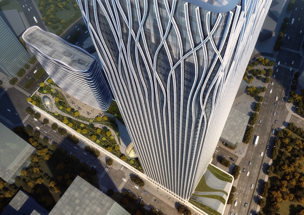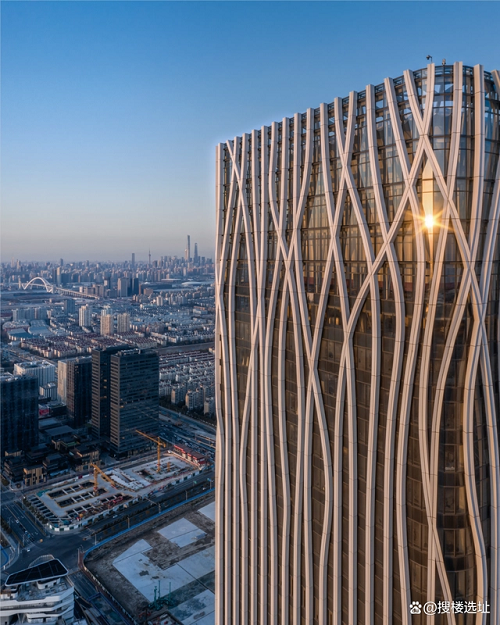 設(shè)計大師“樹”的設(shè)計理念突出體現(xiàn)在外立面幕墻。鋁幕線條從6層開始齊頭并進(jìn)直至215米處,之后線條開始不規(guī)則地“開枝散葉”,使得前灘中心看起來更為靈動、生機勃勃。