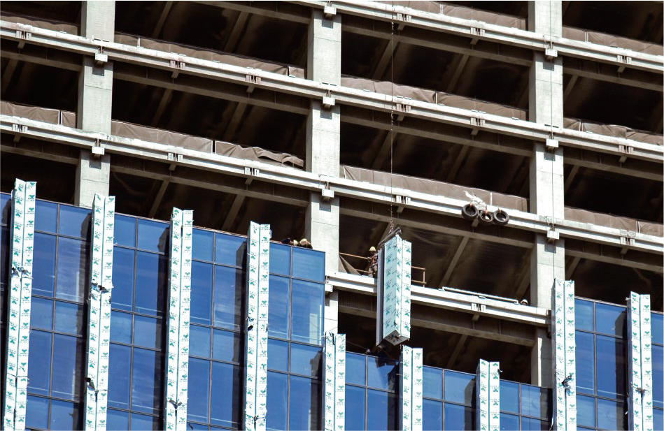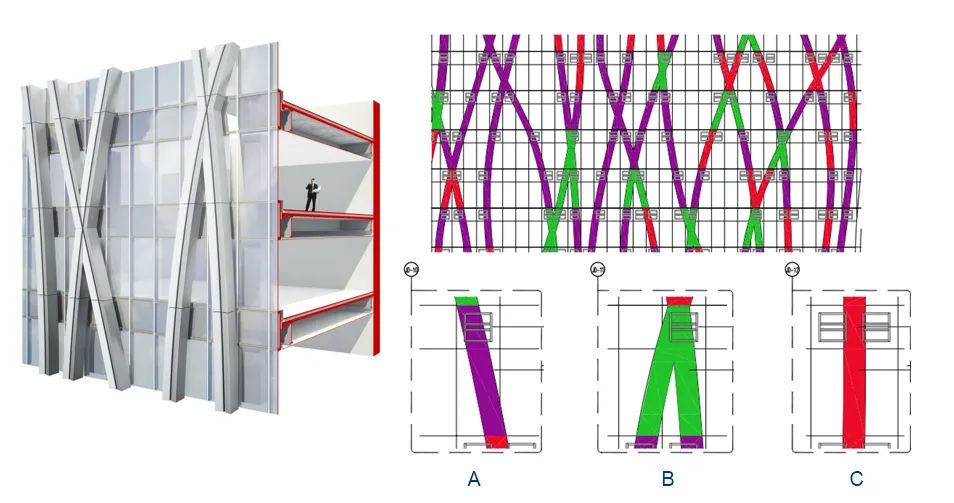 為追求水流的無序美感,塔樓頂端的鋁幕墻裝飾條均為不規(guī)則并伴有交叉的曲線。裝飾條轉(zhuǎn)角部位的鋁幕墻為工藝復(fù)雜雙曲面,項目中最大的一塊單元體線條,零部件數(shù)量超過100個單體,總面積達(dá)到19㎡,精度誤差要求不超過3mm,且安裝高度超過200米,制作和施工難度可想而知。